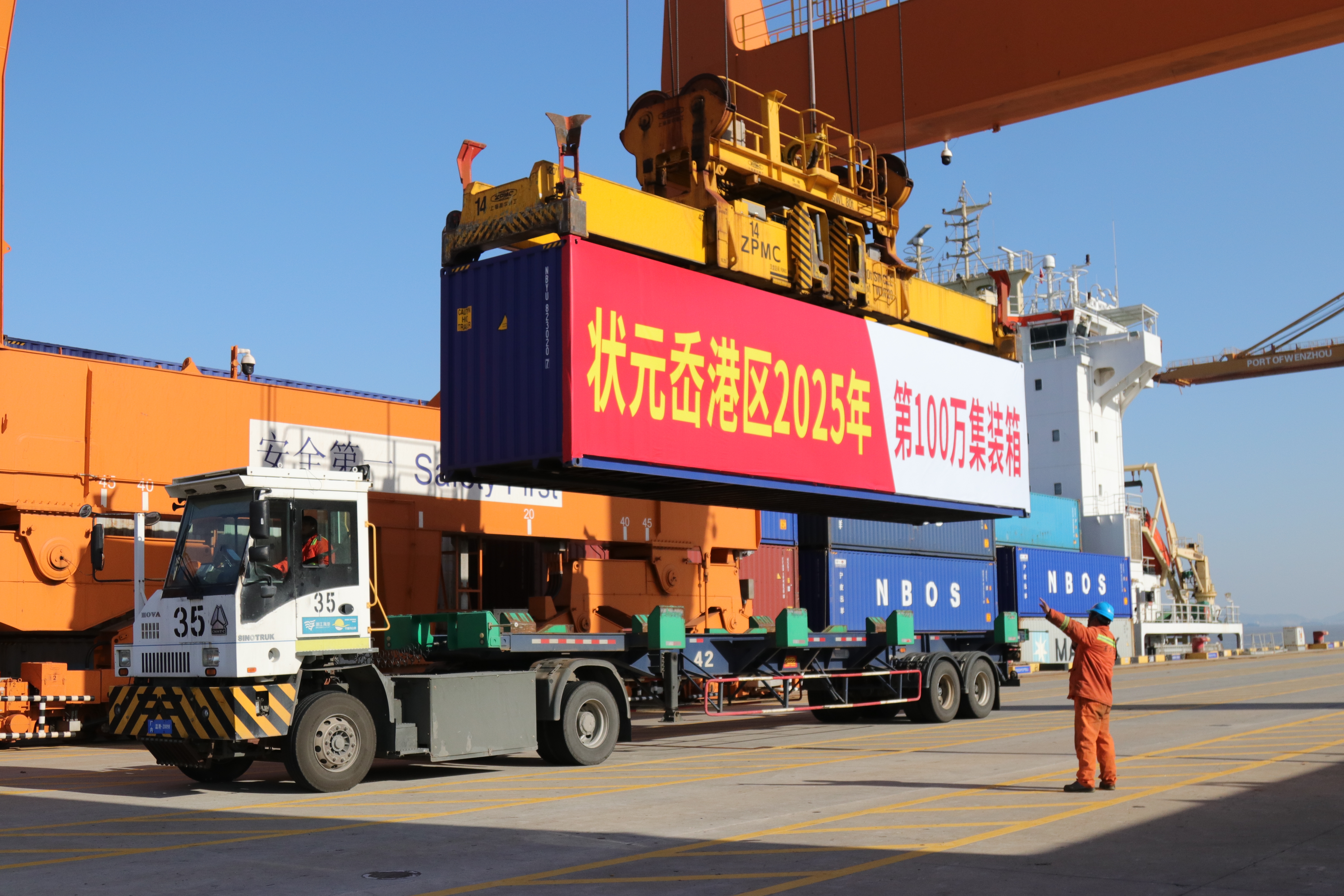 12月21日上午9时许,随着宁波远洋运输股份有限公司 “新明州12”轮缓缓靠泊后,状元岙港区8#桥吊稳稳起吊,精准地将2025年第100万标准箱吊起,这一具有标志性意义的动作,标志着温州港核心港区迎来历史性时刻——状元岙港区集装箱年吞吐量首次突破100万标准箱,是温州市首个年吞吐量突破百万标箱大关的港口单位。
